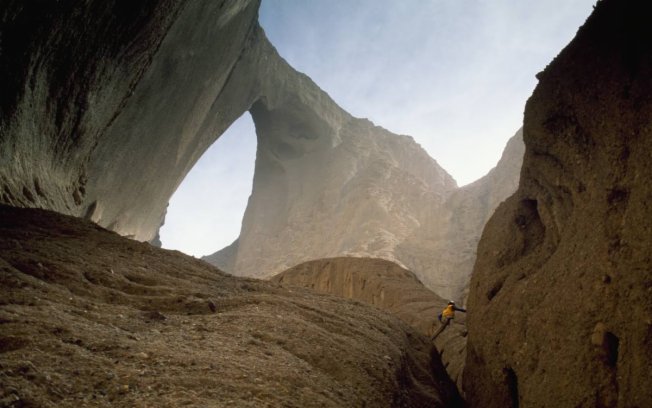 Foto: Gordon Wiltsie / National Geographic Image Sales; Alpinista escala cânion abaixo do Arco Shipton, na China